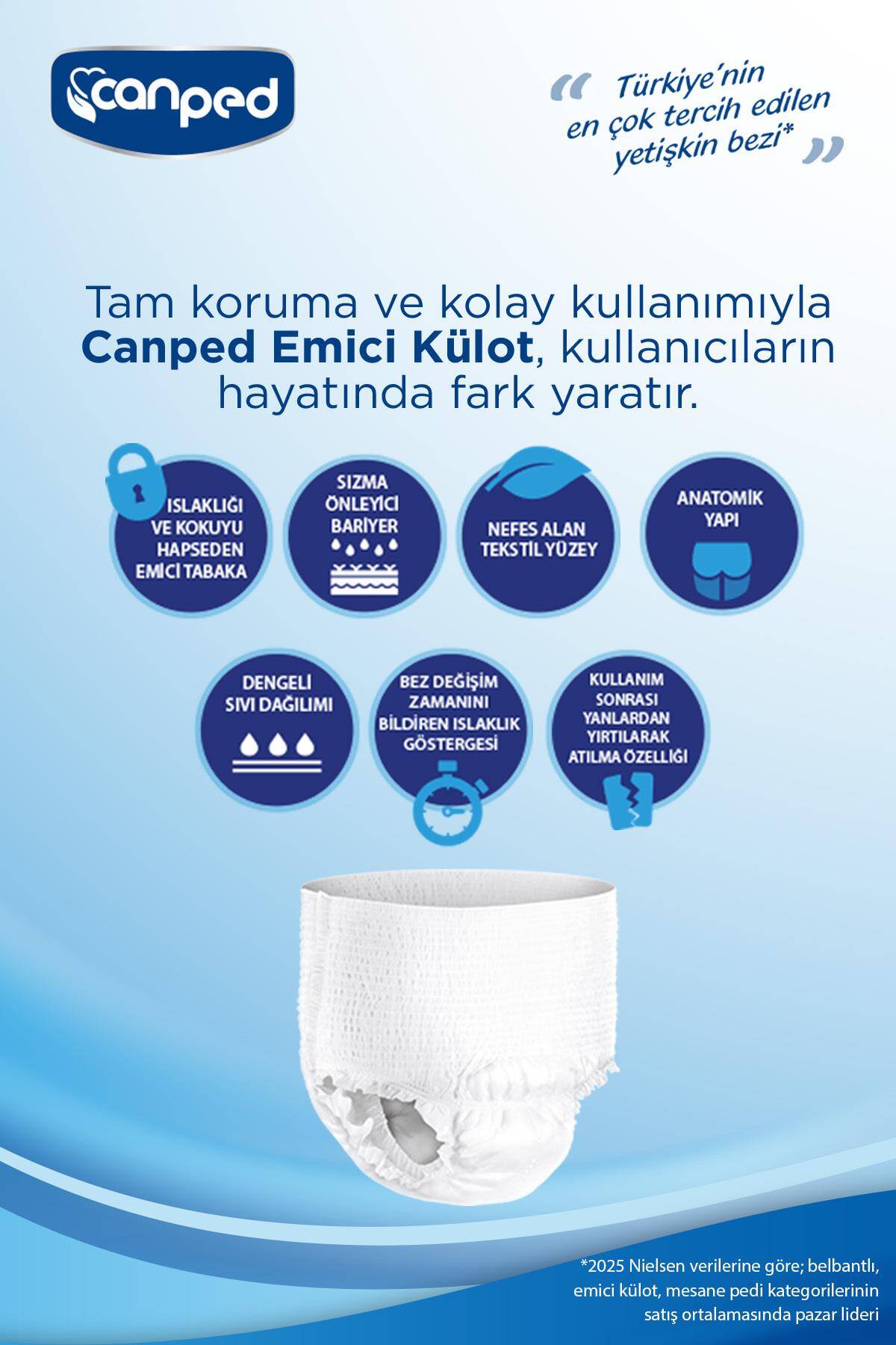 100-150 cm bel ölçüsü uyumlu Canped L-Large emici külot (30 Adet), yüksek emiş gücü ve nefes alan yüzeyiyle tam koruma sağlar. Neomed Market güvencesi ve gizli paketleme ile kapınızda