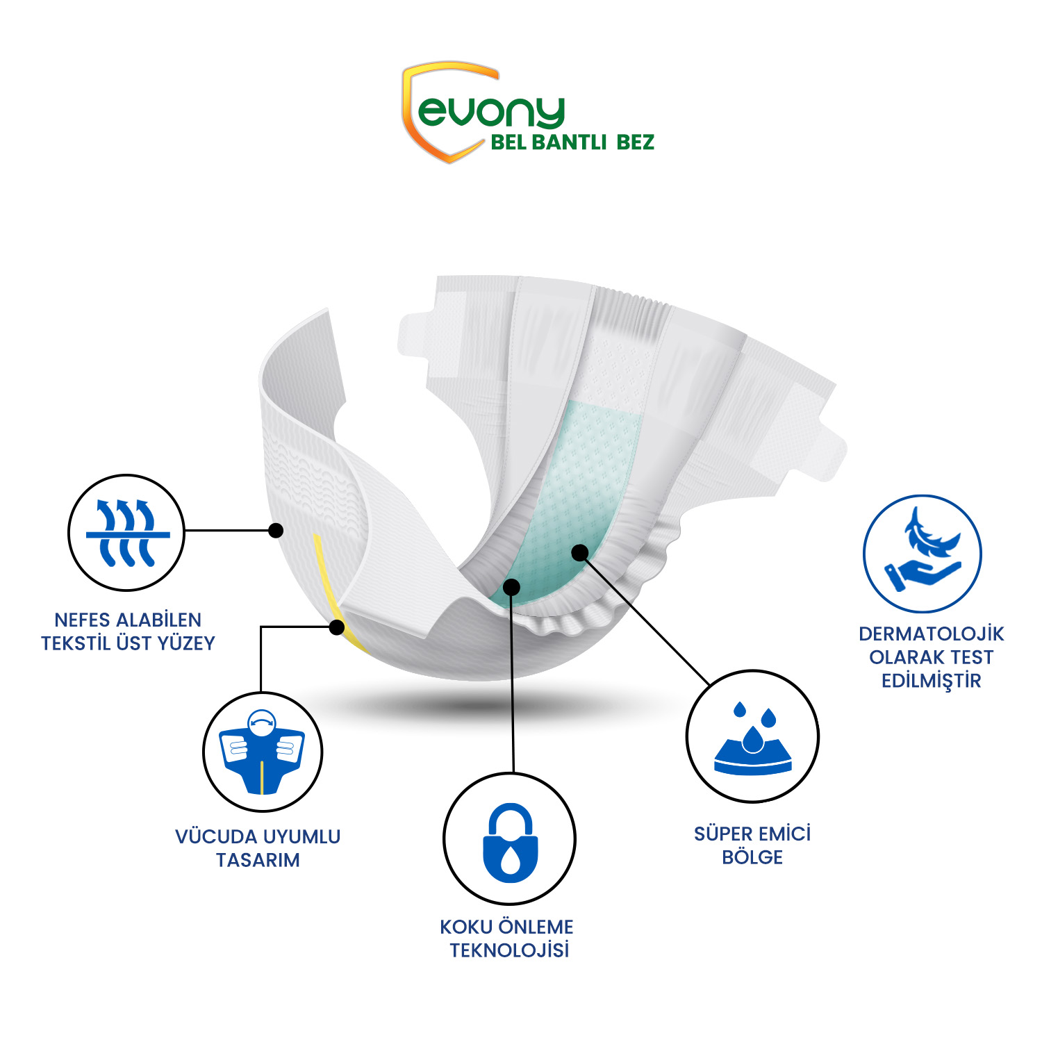 Evony Premium Esnek Belbantlı Hasta Bezi, yetişkinler için üst düzey konfor ve maksimum koruma sunar. 120 adet ekonomik paketi ile uzun süreli kullanım imkanı sağlayan bu large hasta bezi, 100-150 cm bel ölçüsüne uygun olarak tasarlanmıştır. Yenilikçi formülü ve koku önleyici teknolojisi ile gün boyu ve tüm gece huzurlu bir koruma vaat eder.