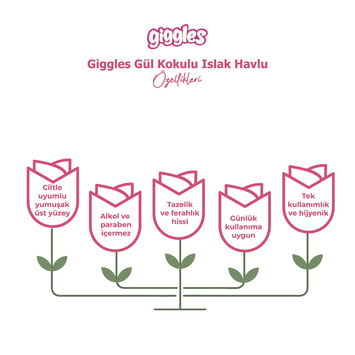 Giggles Gül Kokulu Islak Havlu, B5 vitamini, zengin E vitamini içeriği ve 5.5 pH dengesi ile cildinizi nazikçe temizlerken doğal bariyerini korur. Dermatolojik olarak test edilmiş özel formülü sayesinde hem yetişkinler hem de bebeklerin hassas ciltleri için güvenle kullanılabilir.