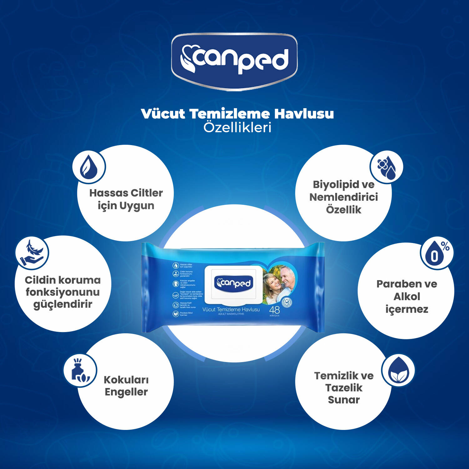 Canped Vücut Temizleme Mendili, sevdiklerinizin hassas ciltleri için özel olarak geliştirilmiştir. Cildi nazikçe temizlerken tazelik hissi verir ve istenmeyen kokuları engeller. Doğal biyolipid ve nemlendirici içeriği sayesinde cilt kuruluğuna karşı koruma sağlar.