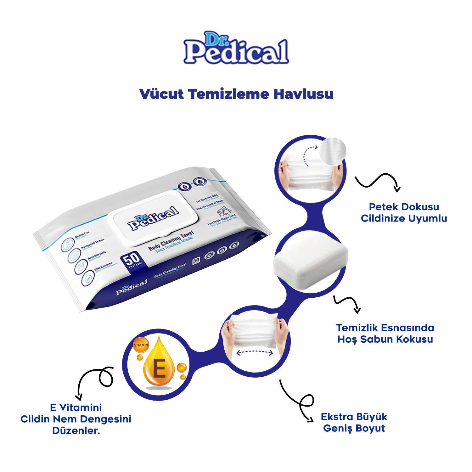 Dr.Pedical Vücut Temizleme Havlusu, günlük yaşamda pratik hijyen ve temizlik için özel olarak geliştirilmiş bir üründür. Her bir yaprağı yüksek kaliteli malzemelerden üretilmiştir ve yumuşak dokusu ile cilde nazik bir temizlik sağlar.