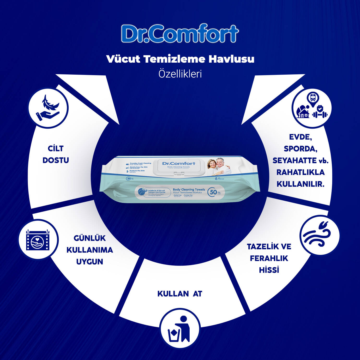 Dr.Comfort Vücut Temizleme Havlusu, günlük temizlik ve hijyen ihtiyacınızı karşılamak için özel olarak geliştirilmiş pratik bir üründür. Her pakette bulunan 50 adet tek kullanımlık havlu, kullan-at prensibiyle hijyenik temizlik sağlar. Evde, spor salonunda, seyahatte veya hastane ortamında rahatlıkla kullanılabilir.
