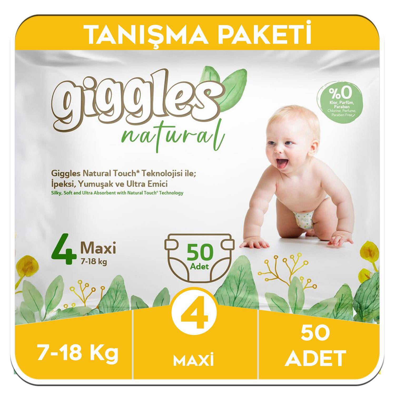 Giggles Natural 4 Numara Maxi Pamuklu Bebek Bezi Tanışma Paketi (50 Adet), bu üstün kaliteli bezleri denemek için mükemmel bir başlangıçtır. Doğal içerikleri, hassas cilt uyumu, mükemmel sızdırmazlığı ve dermatolojik güvencesi ile Giggles, bebeğinizin gün boyu kuru, rahat ve mutlu kalmasını sağlarken sizin de içinizin rahat etmesine yardımcı olur. Hareketli bebeğinizin ihtiyaç duyduğu güvenilir korumayı doğanın yumuşaklığı ile sunan Giggles Natural ile tanışın, farkı hissedin.