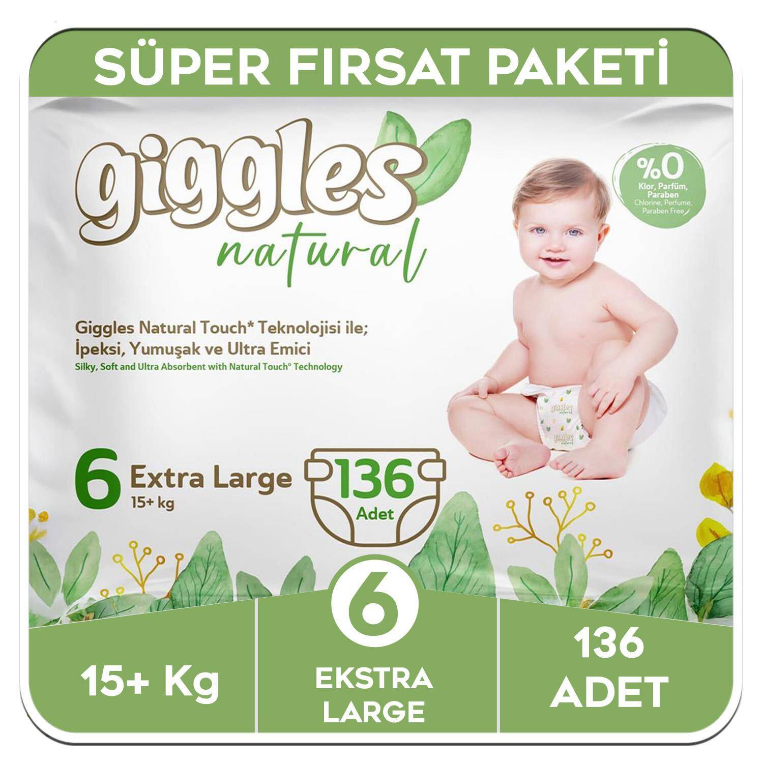 Giggles Natural 6 Numara Junior Pamuklu Bebek Bezi Süper Fırsat Paketi - 136 Adet