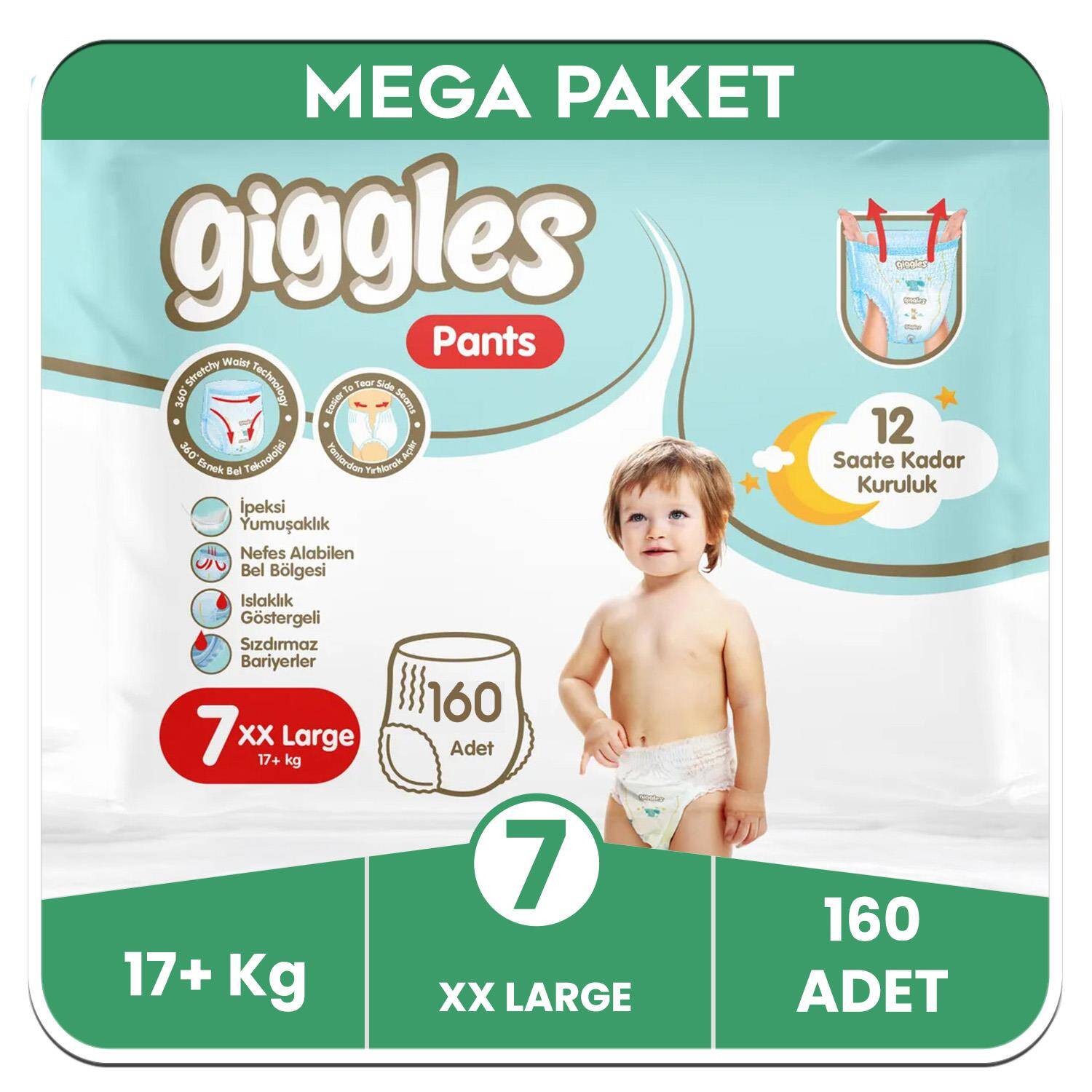 Giggles Pants Külotlu Bebek Bezi 7 Numara XX Extra Large Mega Paket (160 Adet), 17 kg ve üzeri büyük bebekler için özel olarak geliştirilmiş, uzun süreli kullanım için ideal bir çözümdür. Üstün emici teknolojisiyle 12 saate kadar kesintisiz kuruluk sağlayarak, en aktif bebeklerin bile gece-gündüz ihtiyaçlarını karşılar. İpeksi yumuşak dokusuyla cilt dostu bir kullanım sunarken, 360 derece esnek bel bölgesi bebeğinize rahat hareket özgürlüğü tanır.